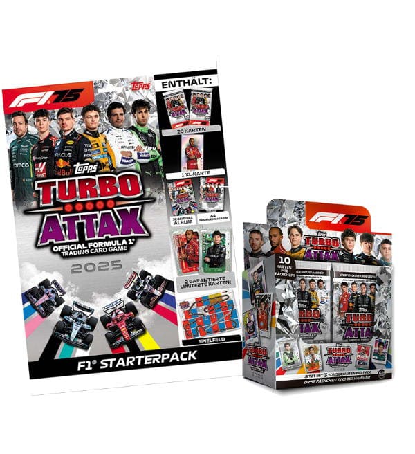 Starterpack + caixa de 24 saquetas para a coleção de "Topps Formula 1 Turbo Attax 2025" Trading Cards com o seguinte conteúdo: