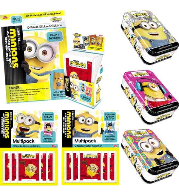 Mega-Bundle da coleção de cromos "Minions - The Rise of Gru" 2022 com o seguinte conteúdo:
