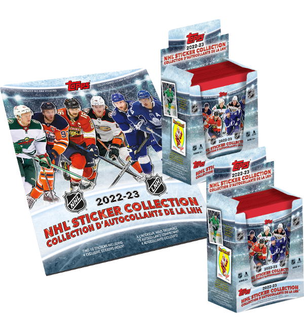 Álbum + 2 Caixas (=100 saquetas) da coleção de cromos "Topps NHL 2022/23 Hockey". Cada saqueta contém 5 cromos.