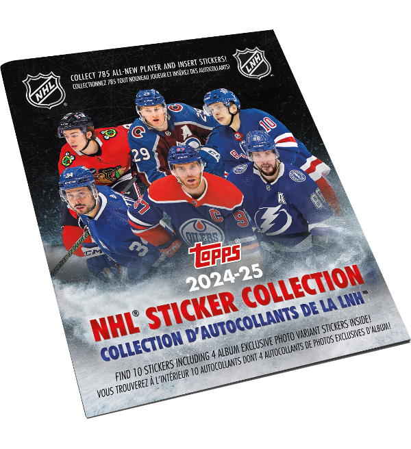 Álbum com 95 páginas e 4 cromos exclusivos da coleção de cromos "Topps NHL 2024-25 Hockey".