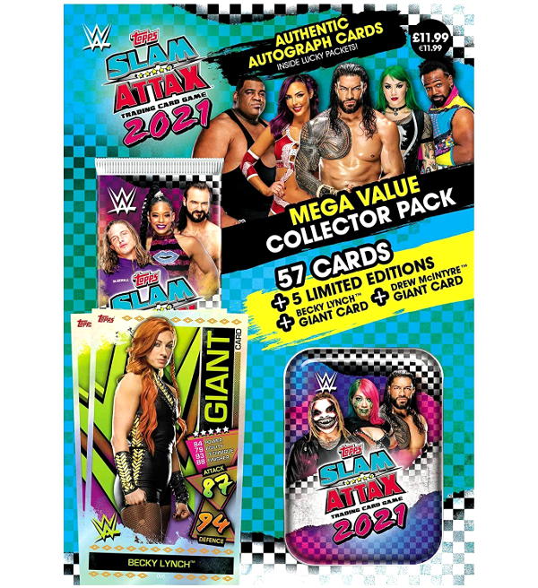 Mega Value Collector Pack para a coleção de "Topps WWE Slam Attax 2021" Trading Cards com o seguinte conteúdo: