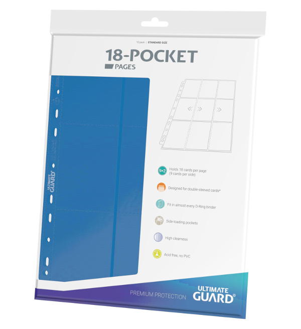 Páginas de capa dupla face de alta qualidade (18 bolsos, 9 bolsos na frente e no verso), adequadas para quase todas as pastas de argolas graças aos 11 furos com uma tira de furos duplamente reforçada. Cada pacote contém 10 páginas para o transporte e guarda de um total de pelo menos 180 cartas (18 por página) em duas mangas (dupla manga).