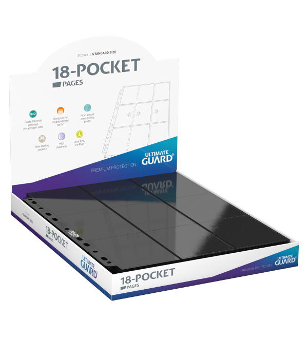Páginas de capa dupla face de alta qualidade (18 bolsos, 9 bolsos na frente e no verso), adequadas para quase todas as pastas de argolas graças aos 11 furos com uma tira de furos duplamente reforçada. Cada pacote contém 50 páginas para o transporte e guarda de um total de pelo menos 900 cartas (18 por página) em duas mangas (dupla manga).