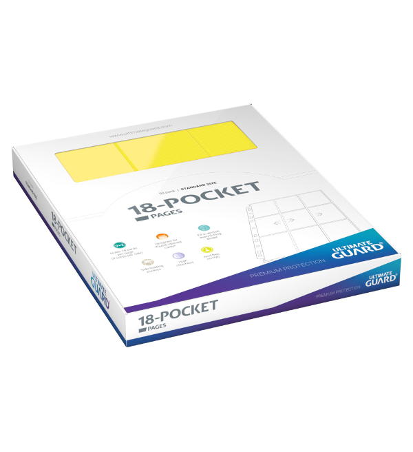 Páginas de capa dupla face de alta qualidade (18 bolsos, 9 bolsos na frente e no verso), adequadas para quase todas as pastas de argolas graças aos 11 furos com uma tira de furos duplamente reforçada. Cada pacote contém 50 páginas para o transporte e guarda de um total de pelo menos 900 cartas (18 por página) em duas mangas (dupla manga).