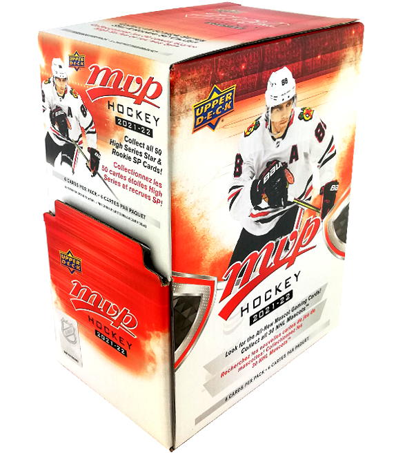 Gravity Feed Box de 36 saquetas da coleção de "Upper Deck NHL 2021-22 MVP Hockey" Trading Cards. Cada saqueta contém 6 cards, o que perfaz um número total de 216 cards por caixa.
