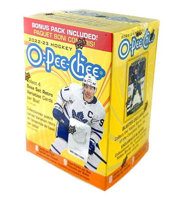 Blaster Box de 9 saquetas da coleção de "Upper Deck NHL 2022-23 Hockey - O-Pee-Chee" Trading Cards. Cada saqueta contém 8 cards, o que perfaz um número total de 72 cards por caixa.