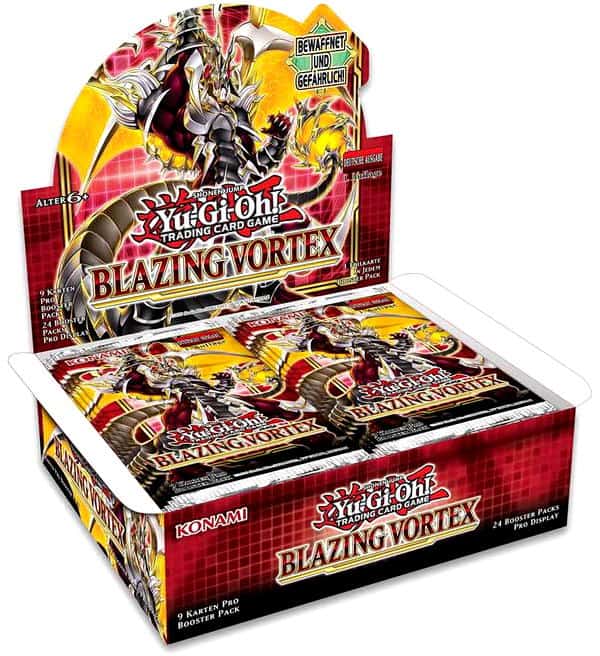 Caixa de 24 saquetas da coleção "Yu-Gi-Oh! Blazing Vortex" Trading Cards. Cada saqueta contém 9 cards, o que perfaz um número total de 216 cards por caixa.